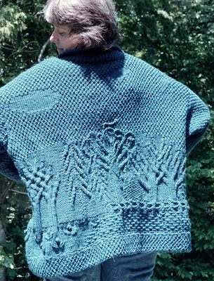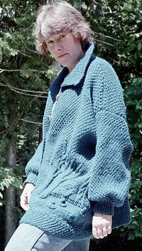 This sweater took 10+ skeins of Annabel Fox Aran Azure. Presented with thanks to the Sue and company at YarnXpress--it was their cyberproject