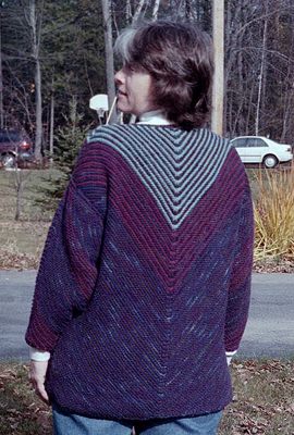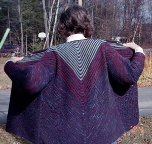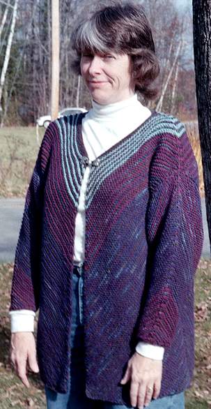 This is the Pyramid Jacket from Interweave Knits Fall 2000. I used three colors of Brown Sheep Cotton Fleece and Barbara Lundy Stone beaded cotton in the Tapestry colorway. The jacket is VERY comfortable and drapey. I may yet decide to convert it into a pullover with a cable up the front! I worked from the schematic and changed the gauge without much problem...